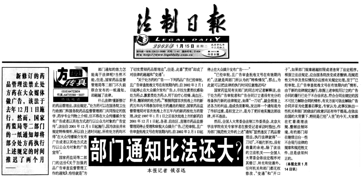 2001年修訂的藥品管理法禁止處方藥在大眾媒體做廣告,然而國(guó)家藥監(jiān)局、國(guó)家工商總局下發(fā)《關(guān)于加強(qiáng)藥品廣告審查監(jiān)督管理工作的通知》卻將部分處方藥執(zhí)行上述規(guī)定的時(shí)間推遲了兩個(gè)月或更久。針對(duì)這個(gè)情況,我采寫批評(píng)報(bào)道《部門通知比法還大?》,刊于2002年1月15日《法制日?qǐng)?bào)》一版。報(bào)道指出,作為部門規(guī)范性文件的上述“通知”顯然違反了藥品管理法。除了該法的立法機(jī)關(guān)——全國(guó)人大常委會(huì)依法定程序?qū)ζ湫抻?、補(bǔ)充和完善外,任何機(jī)關(guān)和部門都無(wú)權(quán)修改、“變通”和“開口子”。此事反映出一些機(jī)關(guān)和部門的依法行政意識(shí)和水平、乃至最基本的法律意識(shí),都還滯留在一個(gè)不高的層面。在依法治國(guó)大背景下、特別是已經(jīng)“入世”的今天,有的部門卻在繼續(xù)出臺(tái)一些不合現(xiàn)行法律的規(guī)章和規(guī)范性文件,是亟需糾正的。報(bào)道反響較大,1月17日,我繼續(xù)作跟蹤報(bào)道《豈能非法變通或“架空”法律》,全國(guó)人大常委會(huì)法工委、國(guó)務(wù)院法制辦有關(guān)負(fù)責(zé)人和參加過(guò)藥品管理法最初起草的老專家和黑龍江讀者提出,一些法律在實(shí)施中有時(shí)被部門的規(guī)章或規(guī)范性文件“架空”,一個(gè)行政部門就這樣把法律實(shí)施時(shí)間說(shuō)推遲就推遲是不合法的,不能因?yàn)檫w就一些實(shí)際困難而犧牲法律的權(quán)威性和嚴(yán)肅性。報(bào)道在一定程度上“揭開了蓋子”“敲開了冰山一角”。