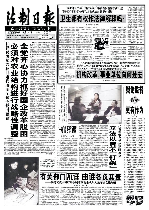 2000年九屆全國(guó)人大三次會(huì)議期間,我作為上會(huì)記者采寫《衛(wèi)生部有權(quán)作法律解釋嗎》,報(bào)道全國(guó)人大代表對(duì)衛(wèi)生部此前聲稱“消費(fèi)者權(quán)益保護(hù)法不適用于醫(yī)療糾紛處理”很不理解,法學(xué)專家也不贊同,認(rèn)為這種“聲明”具有法律解釋性質(zhì),衛(wèi)生部只能對(duì)自己頒布的規(guī)章等進(jìn)行解釋,這個(gè)“聲明”并不具有法律效力。此報(bào)道刊于《法制日?qǐng)?bào)》2000年3月14日一版報(bào)眼。次日又發(fā)追蹤報(bào)道《衛(wèi)生部向人大代表作解釋》。第三天衛(wèi)生部來(lái)人向本報(bào)作解釋,第三篇《衛(wèi)生部向本報(bào)作解釋》未能發(fā)出。