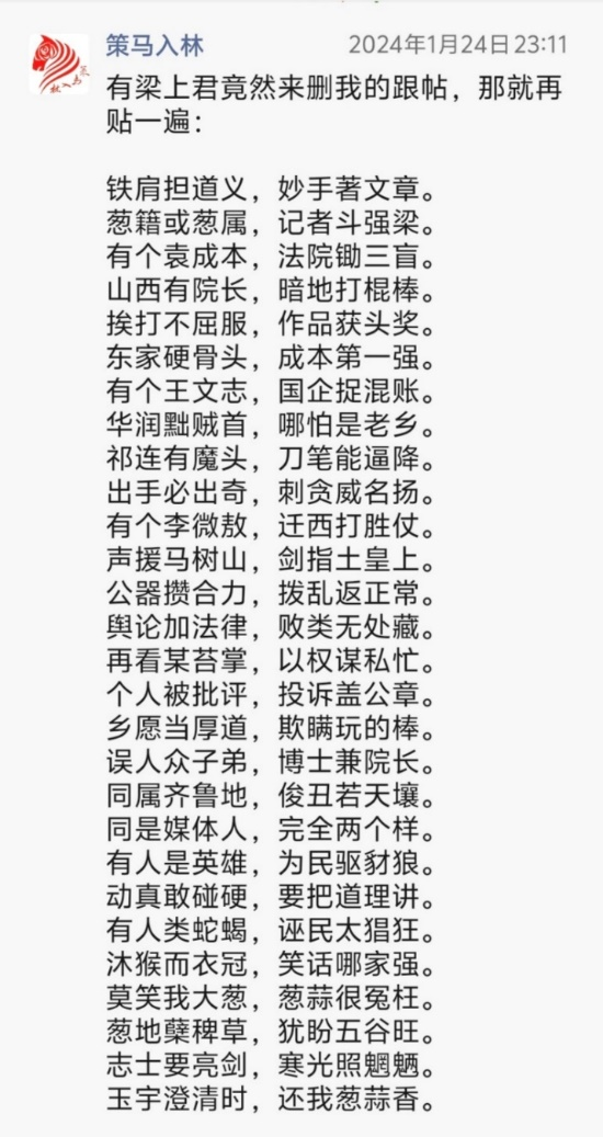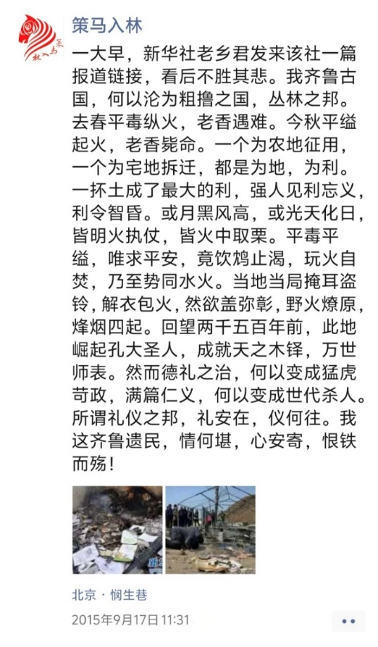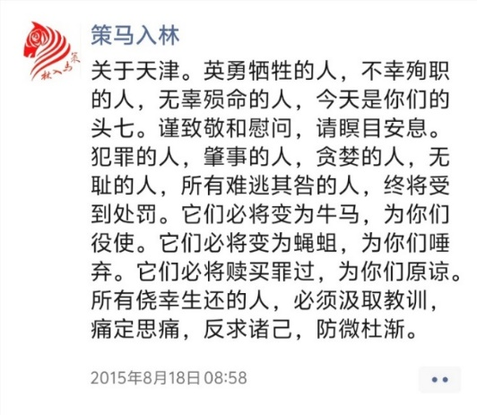 以上三帖,分別為天津8·12濱海新區(qū)爆炸事故“頭七”、山東平度平邑發(fā)生傷民案件、聲援鐵肩擔(dān)道義記者等所發(fā)。多年來(lái),一些案事件頻頻發(fā)生,源于當(dāng)事地方或部門瀆職不作為或?yàn)E權(quán)亂作為,造成嚴(yán)重后果,令人觸目驚心。正氣感召,責(zé)無(wú)旁貸,匕首投槍,敢于斗爭(zhēng)。