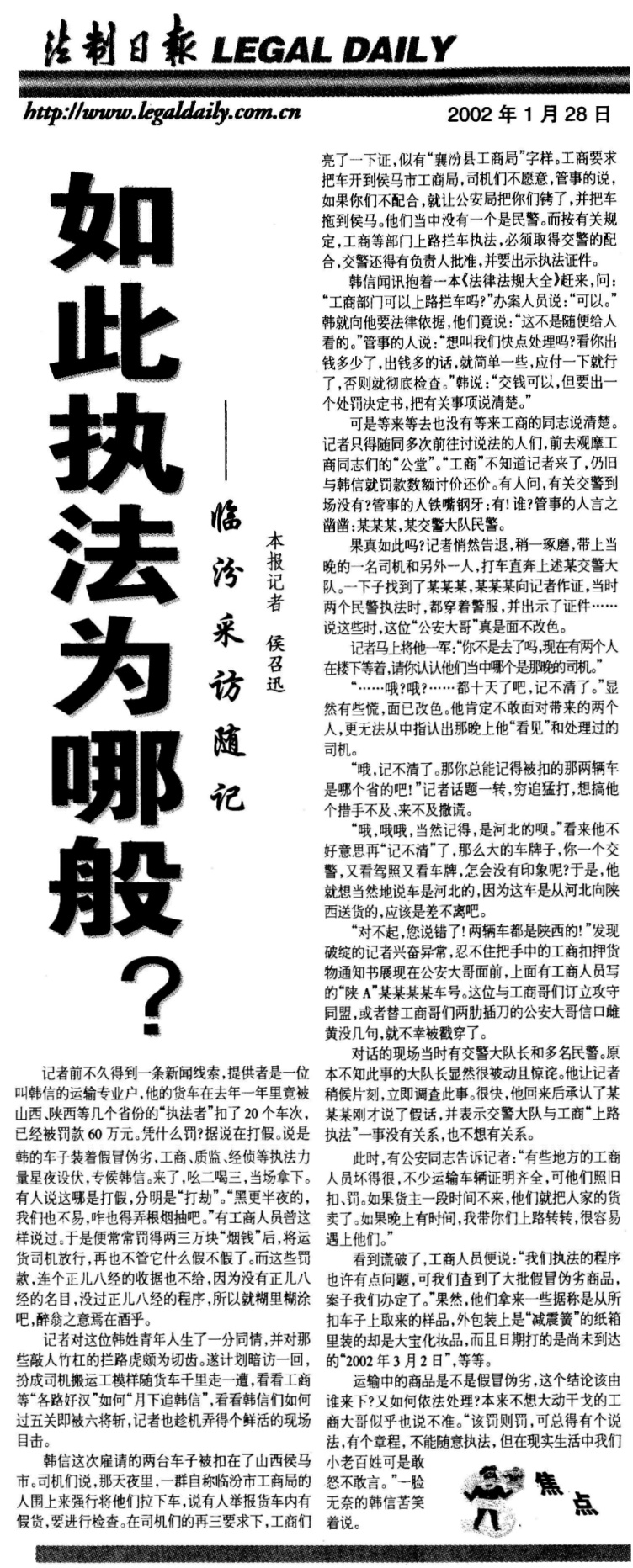 2002年初,針對(duì)山西公路“三亂(亂設(shè)卡、亂收費(fèi)、亂罰款)”之頑瘴痼疾,我根據(jù)一條新聞線索,隨運(yùn)輸業(yè)戶韓信千里赴晉進(jìn)行暗訪。在山西臨汾,分別到工商管理和交警部門暗訪,現(xiàn)場(chǎng)目睹所謂辦案人員拒絕出示執(zhí)法依據(jù)、明目張膽要錢放行,當(dāng)場(chǎng)戳穿了兩家單位人員合伙編造的謊言,對(duì)其濫用職權(quán)亂作為的違法行為予以批評(píng)。相關(guān)報(bào)道《如此執(zhí)法為哪般》刊于2002年1月28日《法制日?qǐng)?bào)》。