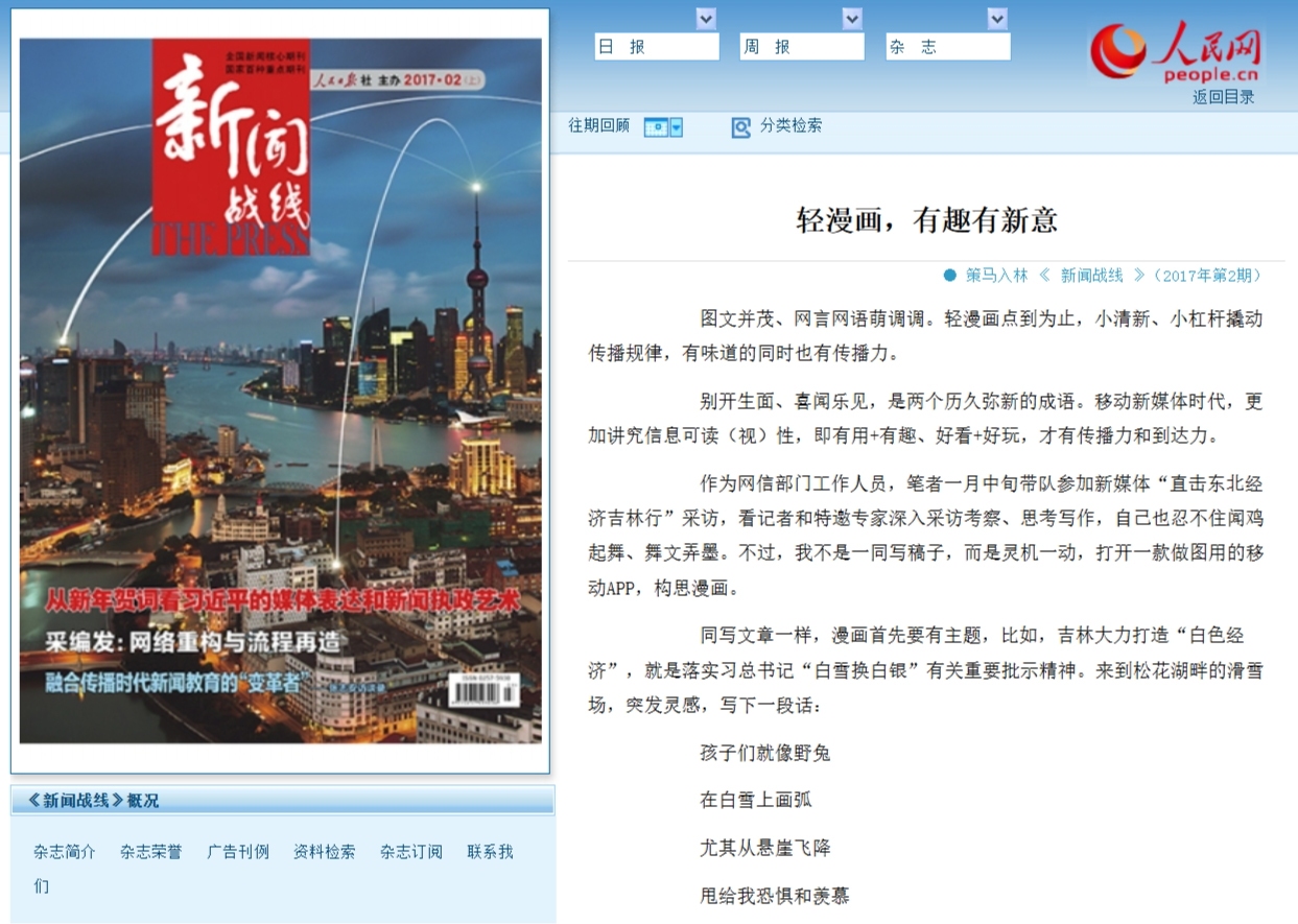 人民日?qǐng)?bào)社《新聞戰(zhàn)線(xiàn)》雜志2017年第2期刊發(fā)《輕漫畫(huà),有趣有新意》。