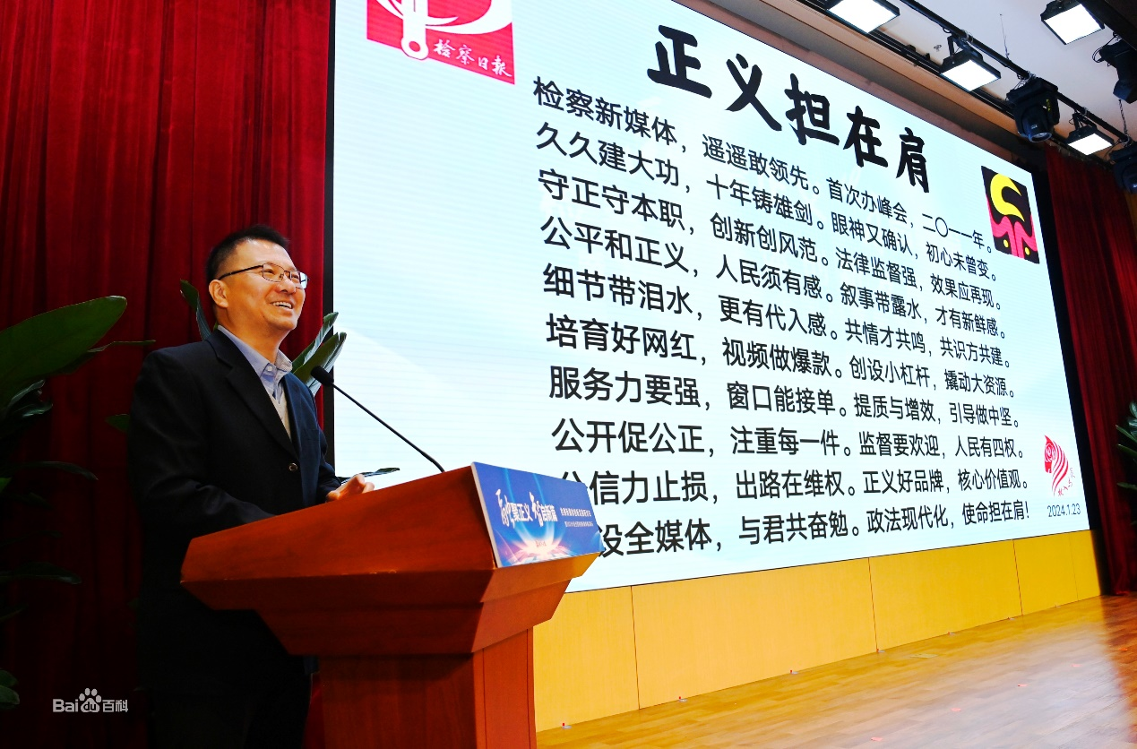 2024年1月23日,參加檢察新媒體創(chuàng)新發(fā)展研討會(huì)暨2023年度全國(guó)檢察新媒體精品展示活動(dòng),發(fā)言提出:我從2013年至今參加過(guò)6屆檢察日?qǐng)?bào)社新媒體活動(dòng),是資深粉絲,有深厚感情。檢察日?qǐng)?bào)社團(tuán)結(jié)檢察機(jī)關(guān)新媒體同仁秉承“強(qiáng)化法律監(jiān)督維護(hù)公平正義”宗旨,久久為功,十年鑄劍,成功打造了“正義”新媒體融媒體品牌,令人備感振奮、備受鼓舞。在新時(shí)代新征程上,希望“正義”新媒體融媒體守正創(chuàng)新,注重共情共鳴,集結(jié)社會(huì)力量,通過(guò)短視頻等新傳播方式,充分呈現(xiàn)法律監(jiān)督效果,講好政法故事,增強(qiáng)傳播力服務(wù)力監(jiān)督力公信力,讓人民群眾在每一個(gè)司法案件中感受到公平正義。《正義擔(dān)在肩》:檢察新媒體,遙遙敢領(lǐng)先。首次辦峰會(huì),二〇一一年。久久建大功,十年鑄利劍。眼神又確認(rèn),初心未曾變。守正守本職,創(chuàng)新創(chuàng)風(fēng)范。法律監(jiān)督強(qiáng),效果應(yīng)再現(xiàn)。公平和正義,人民須有感。敘事帶露水,才有新鮮感。細(xì)節(jié)帶淚水,更有代入感。共情才共鳴,共識(shí)方共建。培育好網(wǎng)紅,視頻做爆款。創(chuàng)設(shè)小杠桿,撬動(dòng)大資源。服務(wù)力要強(qiáng),窗口能接單。提質(zhì)與增效,引導(dǎo)做中堅(jiān)。公開(kāi)促公正,注重每一件。監(jiān)督要?dú)g迎,人民有四權(quán)。公信力止損,出路在維權(quán)。正義好品牌,核心價(jià)值觀。建設(shè)全媒體,與君共奮勉。政法現(xiàn)代化,使命擔(dān)在肩。