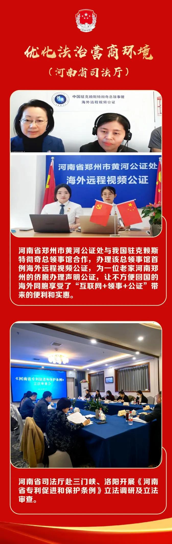 去年以來,我們聚焦發(fā)展新質(zhì)生產(chǎn)力、推進中部地區(qū)崛起等中心工作,圍繞河南省委、省政府提出的錨定“兩個確?!薄⒊掷m(xù)實施“十大戰(zhàn)略”、推進“十大建設(shè)”工作部署,不斷優(yōu)化法治化營商環(huán)境,采取了一系列務(wù)實舉措:聚焦提升領(lǐng)導(dǎo)干部法治意識法治思維、提高依法行政能力水平,出臺《關(guān)于進一步加強全面依法治省工作的意見》《河南省領(lǐng)導(dǎo)干部應(yīng)知應(yīng)會黨內(nèi)法規(guī)和國家法律清單》。牽頭制定《河南省營商環(huán)境綜合配套改革法治化專項方案》,部署立法、執(zhí)法、司法、法律服務(wù)、政務(wù)誠信、政務(wù)服務(wù)“六大行動”,明確25項具體任務(wù)。推動出臺《中國(河南)自由貿(mào)易試驗區(qū)條例》《鄭州航空港經(jīng)濟綜合實驗區(qū)條例》,為試(實)驗區(qū)賦權(quán)、松綁,激發(fā)各方主體發(fā)展活力;出臺《河南省保障稅收服務(wù)發(fā)展條例》《河南省專精特新企業(yè)培育支持辦法》和省司法廳服務(wù)保障民營經(jīng)濟發(fā)展10項措施,為中央和河南重大戰(zhàn)略實施提供法治保障。