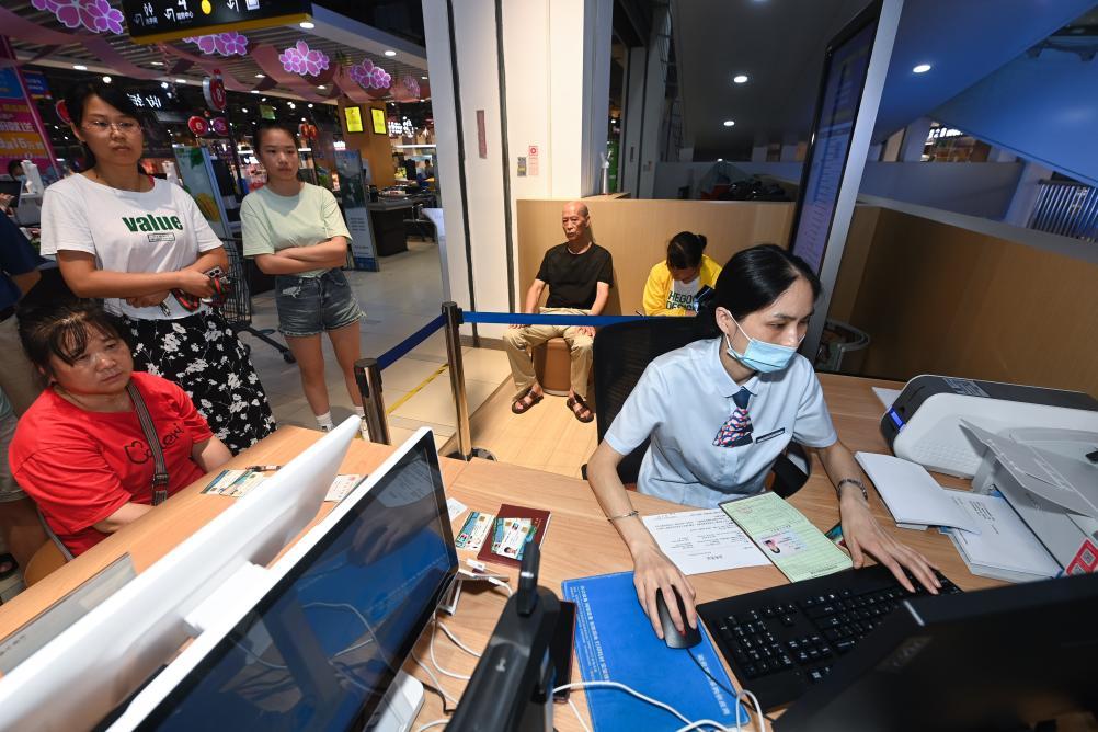 杭州市臨安區(qū)審管辦設(shè)置在一家超市里的便民服務(wù)站辦理市民卡、社保等業(yè)務(wù)。新華社記者徐昱 攝