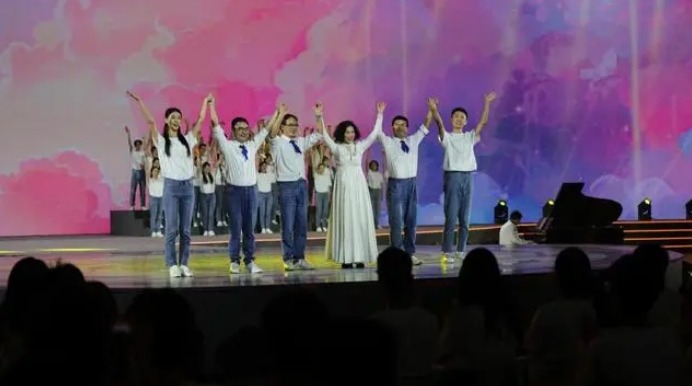 電子科技大學(xué)學(xué)生合唱團(tuán)與退休教職工組成的銀杏合唱團(tuán)共同演繹《一路生花》 楊曉恒攝