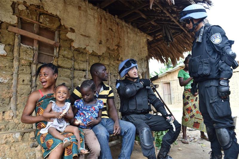2015年11月3日,在利比里亞格林維爾一座村莊,中國維和警察防暴隊(duì)隊(duì)員詢問近期治安等情況。