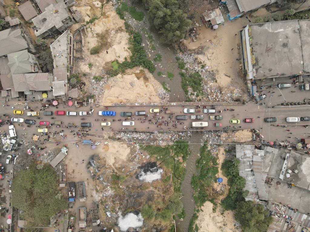 8月17日,在剛果(金)首都金沙薩郊區(qū)的金蘇卡大橋上,通行車輛在橋上駛過。(無人機照片)