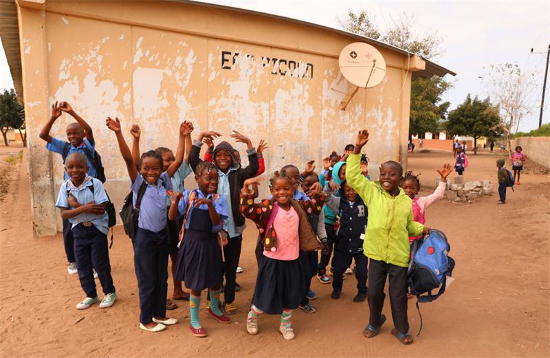 2023年7月25日,莫桑比克馬普托省皮科科村學(xué)校的孩子們站在裝有中國援助的衛(wèi)星電視接收天線的房屋前?!叭f村通”項(xiàng)目旨在為非洲國家的1萬個(gè)村莊接入衛(wèi)星數(shù)字電視信號,項(xiàng)目2018年在莫桑比克啟動(dòng),為該國1000個(gè)村落、2萬戶家庭和3000個(gè)公共場所安裝衛(wèi)星電視設(shè)備,提供電視信號和節(jié)目,覆蓋農(nóng)村人口達(dá)250萬。新華社記者 董江輝 攝