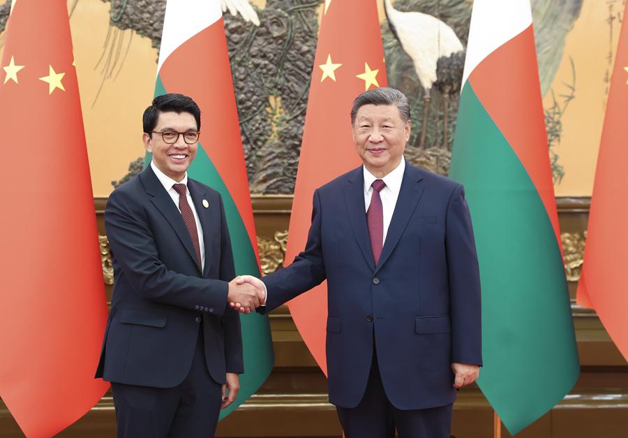 9月6日下午,國家主席習(xí)近平在北京人民大會堂會見來華出席中非合作論壇北京峰會的馬達加斯加總統(tǒng)拉喬利納。