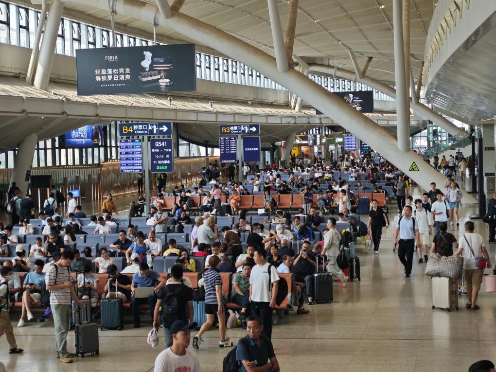 9月13日,旅客們?cè)谖錆h站候車室候車。(楊澤宇 攝)