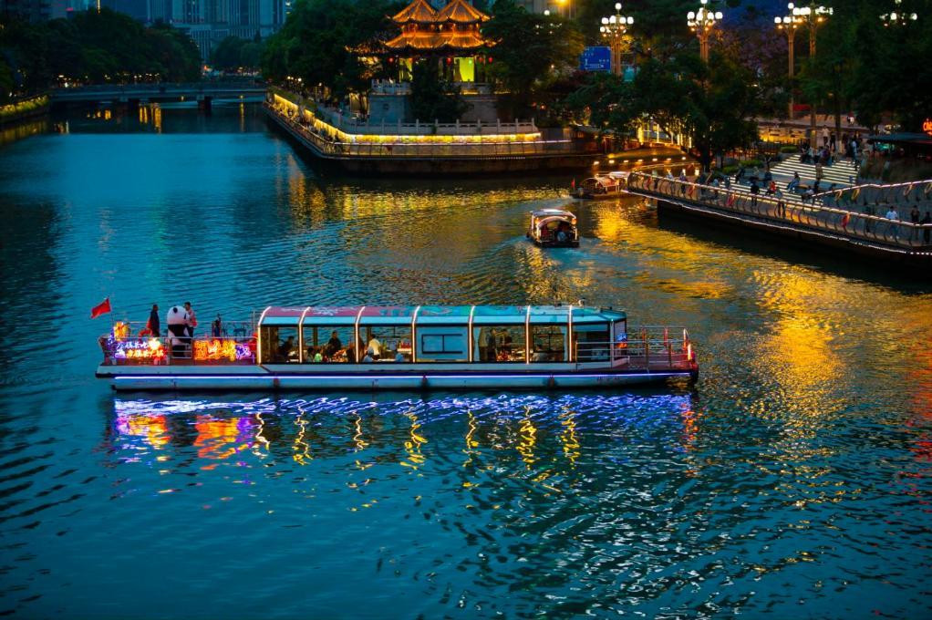 夜幕降臨,一個“月亮”裝置點亮四川成都錦江東門碼頭,人們在此排隊等候登船體驗“夜游錦江”項目。江面上,靈動的“大魚”“神鳥”等飛行裝置伴隨游船行駛飛起;演員扮演嫦娥、玉兔、李白等為游客吟唱詩歌;火鍋船、“江上KTV”、萌寵專線等不同主題游船往來如織。江岸上,沿線茶百戲、漆扇和桂花香囊制作、漢服體驗、潮玩市集、街頭藝人表演等豐富活動吸引市民游客駐足體驗。