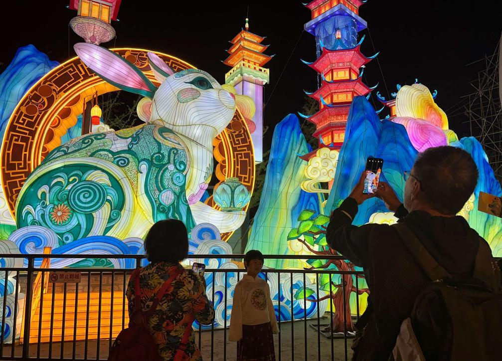 市民游客在2024年北京中秋國慶彩燈游園會欣賞彩燈。新華社記者楊淑君 攝