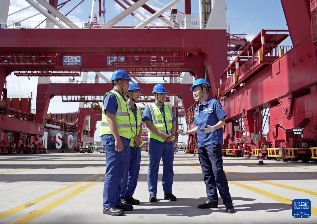 許振超(左二)和團(tuán)隊(duì)成員在碼頭研究傳統(tǒng)集裝箱橋吊的智能化升級(jí)方案(9月2日攝)。新華社發(fā)(閆軍攝)