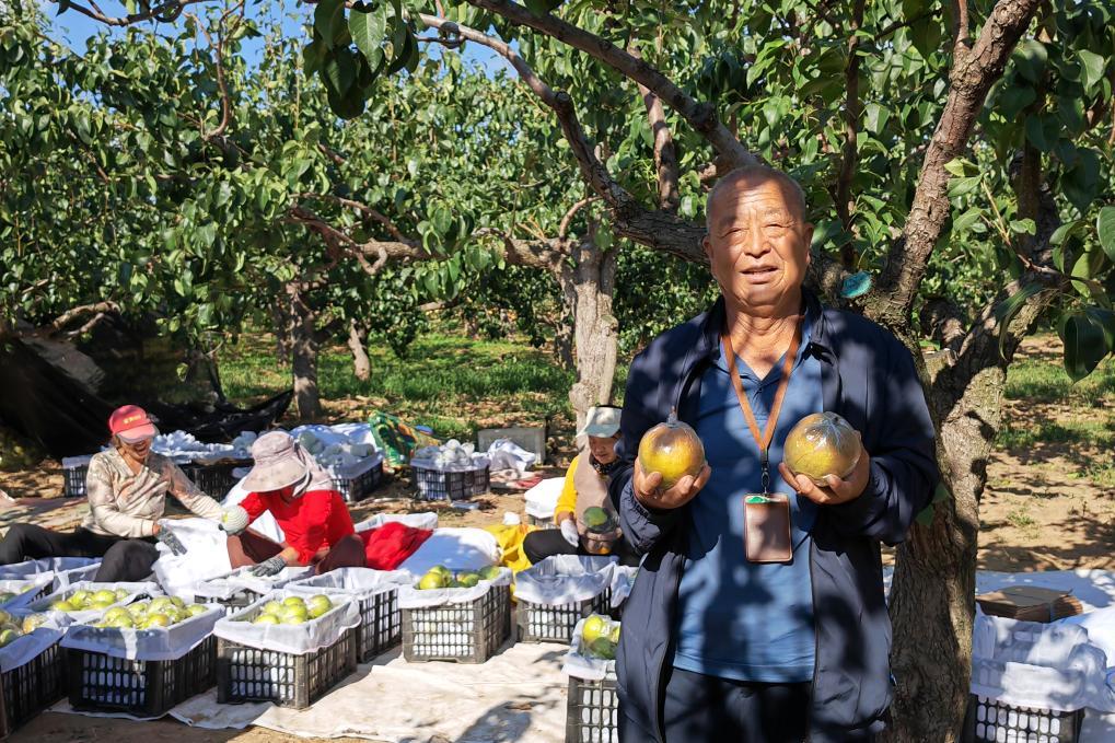 今年78歲的閆云海從20世紀(jì)80年代開(kāi)始種梨,蜜梨、酥梨等品種試了個(gè)遍,最后找到梨果專家引進(jìn)了玉露香梨?!坝衤断憷嫠执?、糖多、色美、皮薄、口感好,而且耐保存。如今我們家三代人都在種玉露香梨。”閆云海說(shuō)。