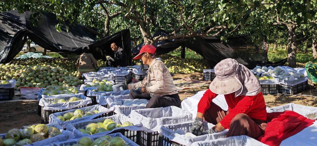 在山西省隰縣午城鎮(zhèn)習(xí)禮村,果農(nóng)們正在挑揀新采摘的玉露香梨。新華社記者 王飛航 攝