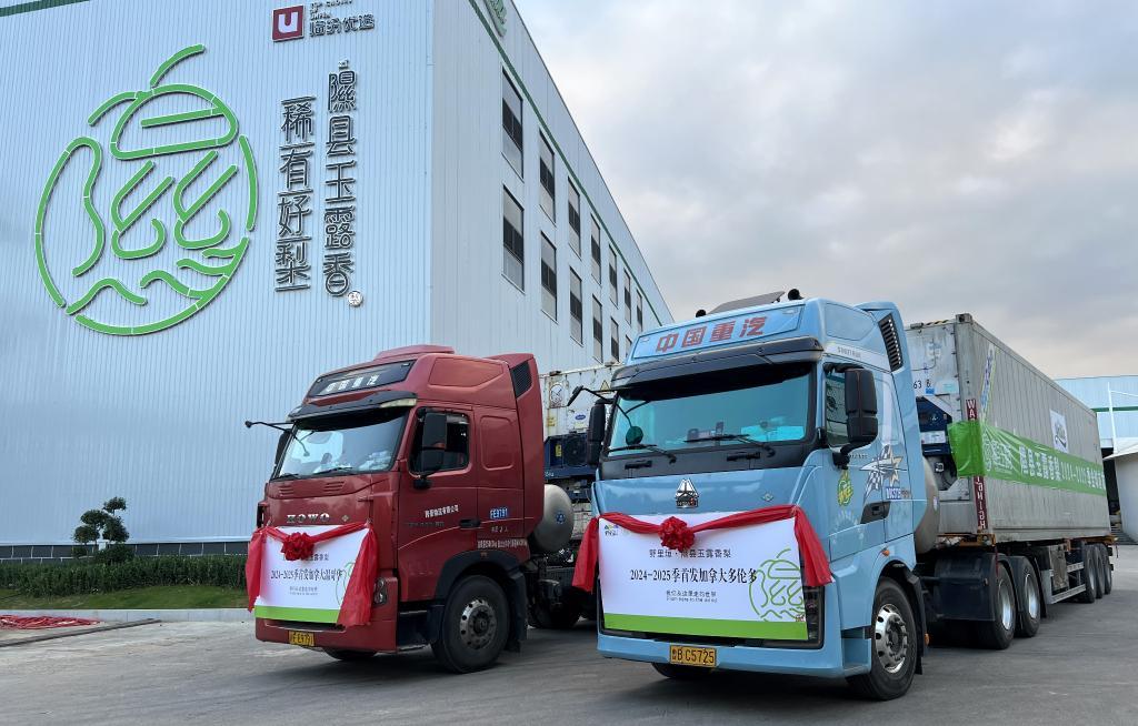 在山西隰縣北緯三十六度電子商務(wù)有限公司,裝滿玉露香梨的貨車(chē)即將發(fā)車(chē)。(受訪者供圖)