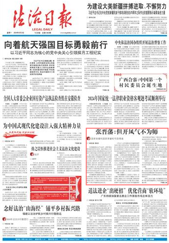 9月16日,94歲高齡的張晉藩教授接受《法治日報(bào)》記者采訪時說:“我取得的所有成績,首先要?dú)w功于我們偉大的黨和偉大的祖國。黨和國家給予了我太多。作為一名黨員,我應(yīng)該全力以赴把法制史的學(xué)問做好。”