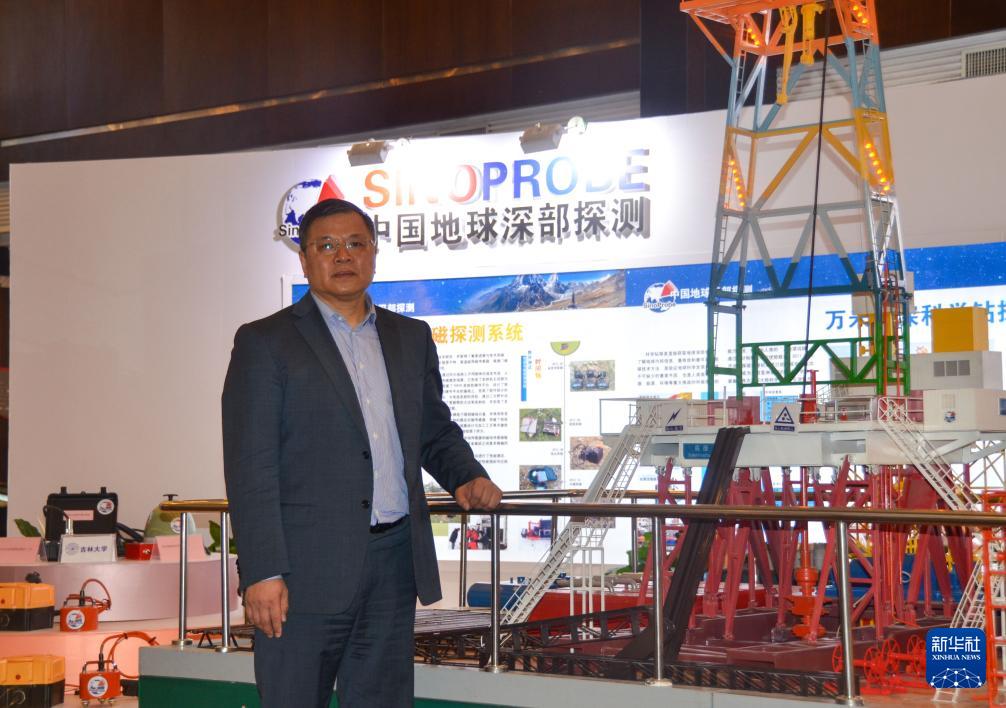 黃大年在中國地球深部探測項(xiàng)目年會(huì)上(2013年4月18日攝),身旁是他率領(lǐng)團(tuán)隊(duì)研發(fā)的“地殼一號(hào)”萬米大陸科學(xué)鉆探機(jī)的展示模型。 新華社發(fā)