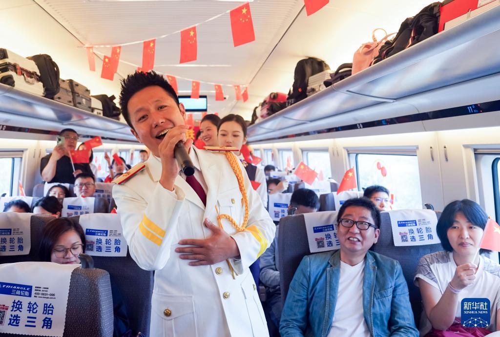9月28日,在上海虹橋開往北京南的G10次高鐵列車上,工作人員在“乘高鐵 迎國慶”主題活動中演唱《我和我的祖國》。