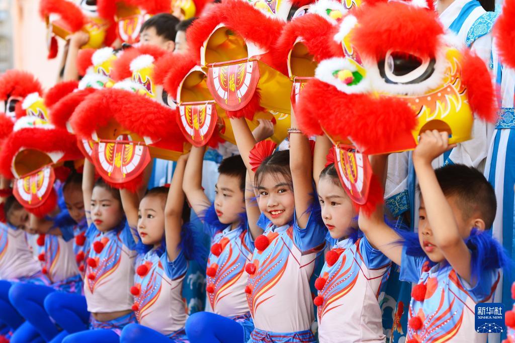 9月27日,在山東青島北仲路第一小學開展的國慶主題系列活動上,小學生在表演獅子舞。