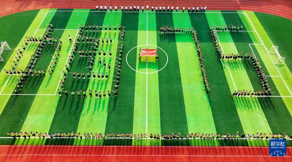 9月27日,在四川省南充市蓬安縣錦屏鎮(zhèn)中心小學(xué)校迎國慶主題活動上,師生與國旗合影(無人機(jī)照片)。
