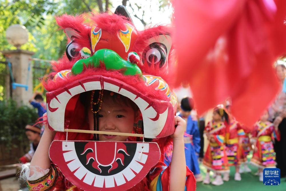 9月27日,小朋友在山東省棗莊市一幼兒園迎國慶活動上舞獅。