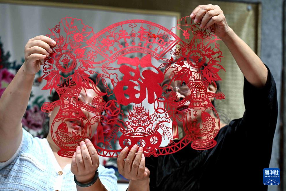 9月27日,河北省石家莊市蔚縣剪紙國家級代表性傳承人周淑英(右)在“展非遺 迎國慶”系列主題活動(dòng)中展示剪紙作品。
