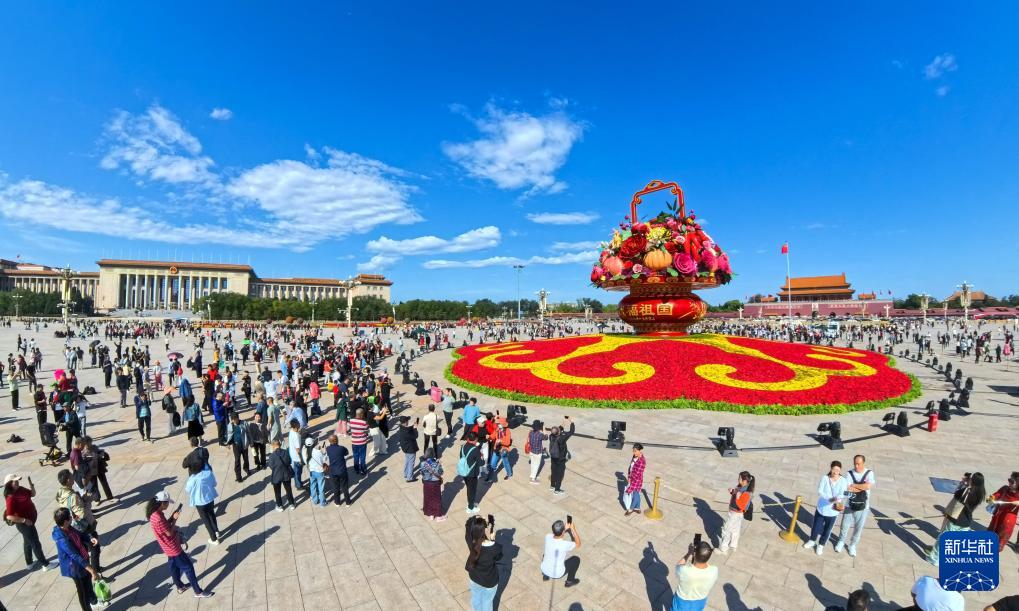 9月25日,游客在天安門廣場(chǎng)觀賞“祝福祖國(guó)”巨型花籃。