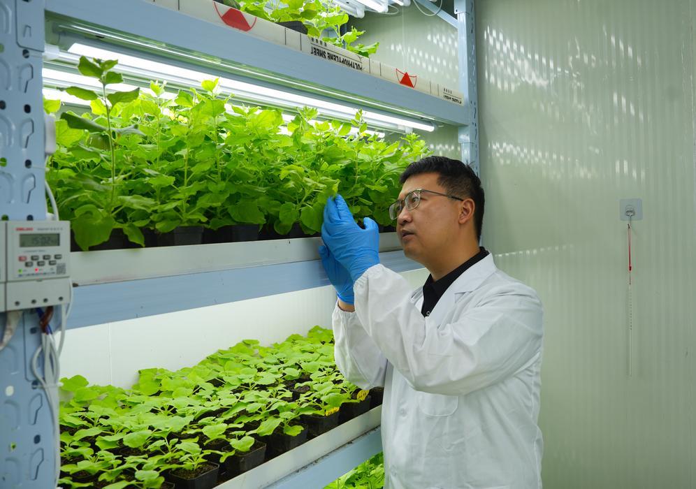 神筆生物創(chuàng)始人李仁漢在實(shí)驗(yàn)室觀察發(fā)光植物生長(zhǎng)情況(10月10日攝)。新華社發(fā)