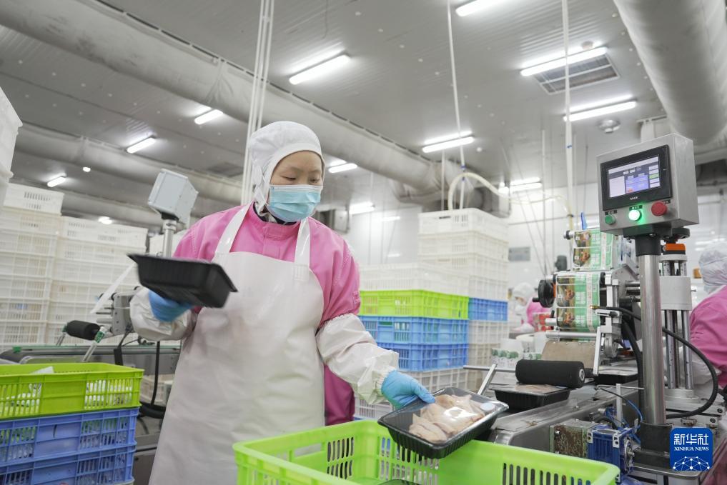 11月29日,在石門(mén)縣一家家禽加工企業(yè)冷鏈車(chē)間,工人在包裝雞肉。