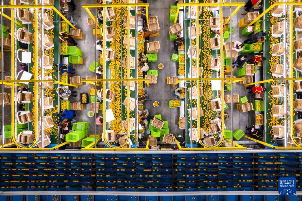 11月1日,在位于石門縣的湖南湘佳橘友農(nóng)業(yè)有限公司,工人在包裝柑橘(無人機(jī)照片)。新華社記者 陳思汗 攝