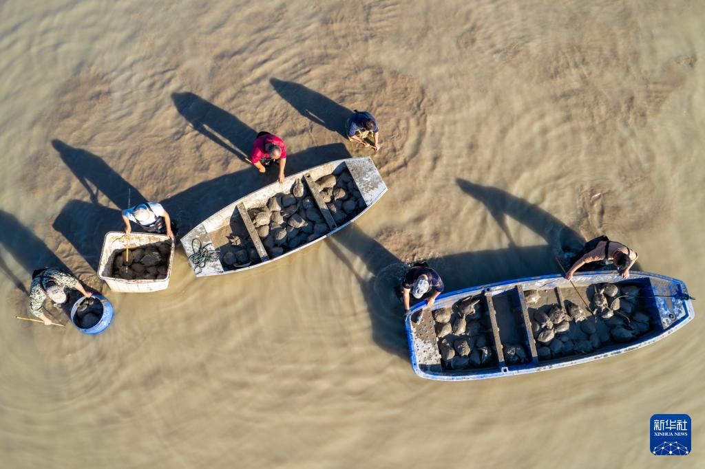 11月29日,在位于漢壽縣的湖南華甲農(nóng)業(yè)集團(tuán)有限公司生態(tài)甲魚產(chǎn)業(yè)園,工人在捕撈甲魚(無人機(jī)照片)。新華社記者 陳思汗 攝