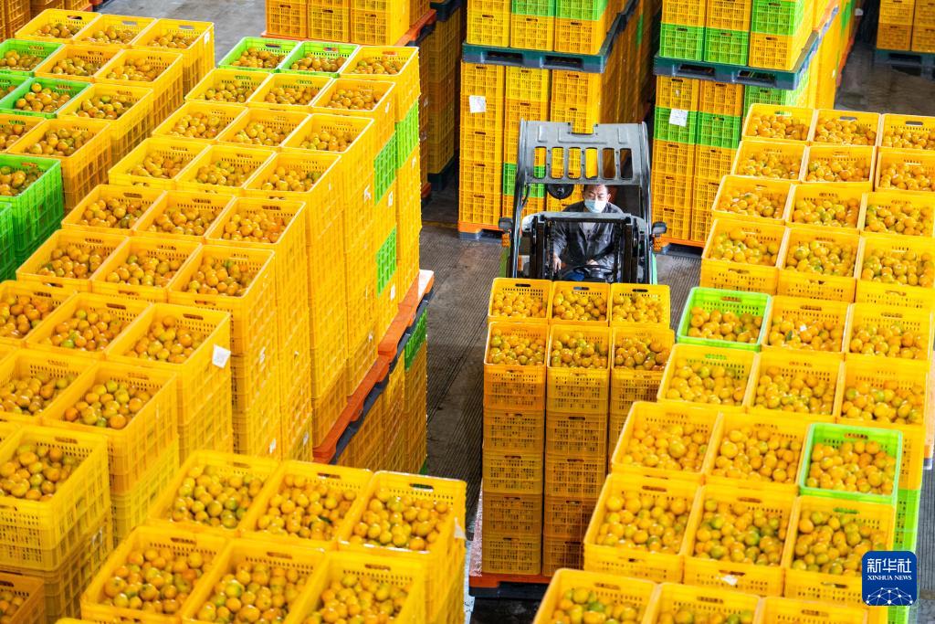 11月1日,在位于石門縣的湖南湘佳橘友農(nóng)業(yè)有限公司,工人在運(yùn)輸柑橘。新華社記者 陳思汗 攝