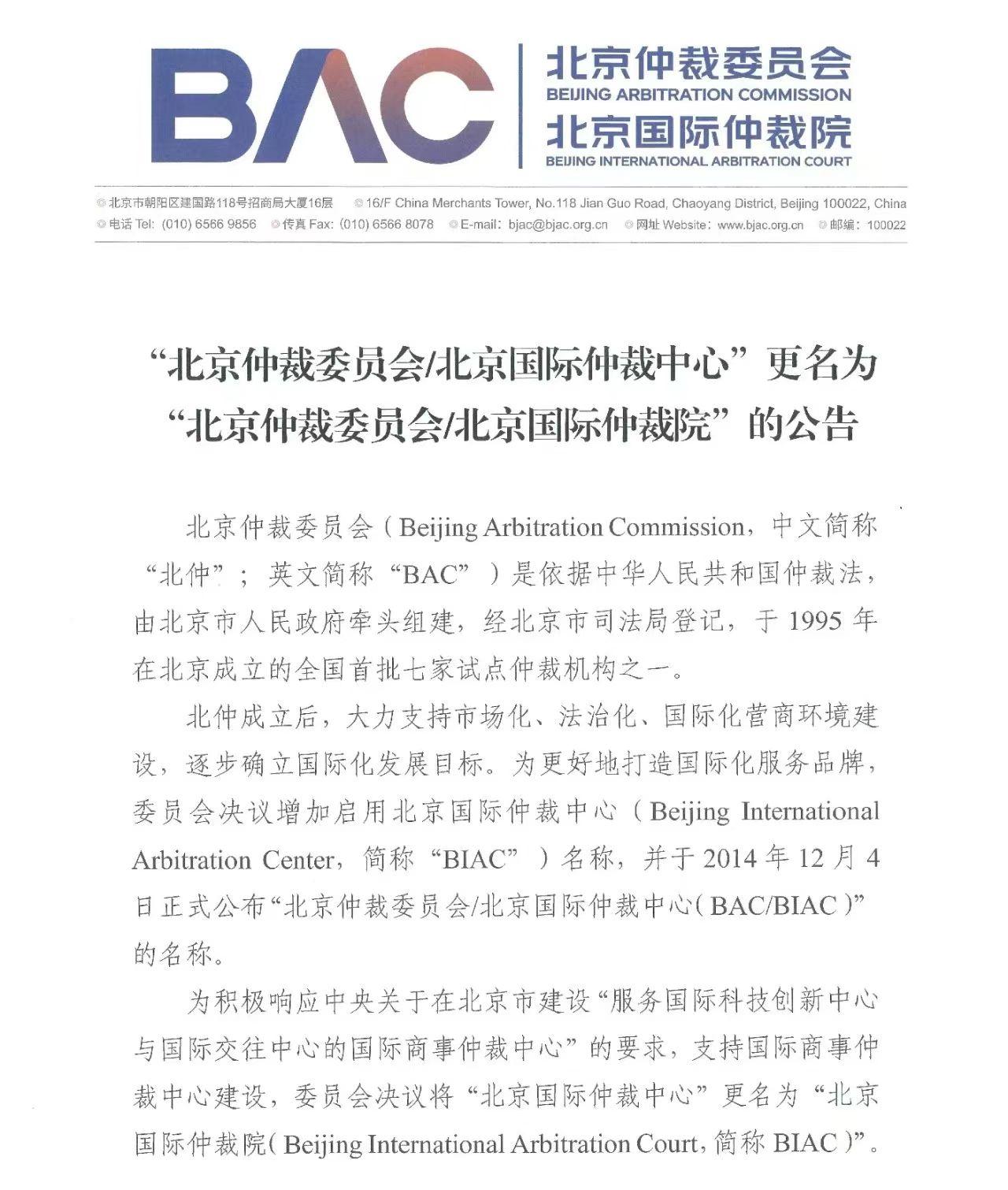 12月10日,記者從“建設(shè)國際一流仲裁機(jī)構(gòu) 助力國際商事仲裁中心建設(shè)”新聞發(fā)布會上獲悉,為積極響應(yīng)中央關(guān)于在北京市打造“服務(wù)國際科技創(chuàng)新中心與國際交往中心建設(shè)的國際商事仲裁中心”的要求,支持國際商事仲裁中心建設(shè),經(jīng)北京市司法局依法變更登記,12月4日“北京仲裁委員會/北京國際仲裁中心”的名稱變更為“北京仲裁委員會/北京國際仲裁院”(以下簡稱北仲)。