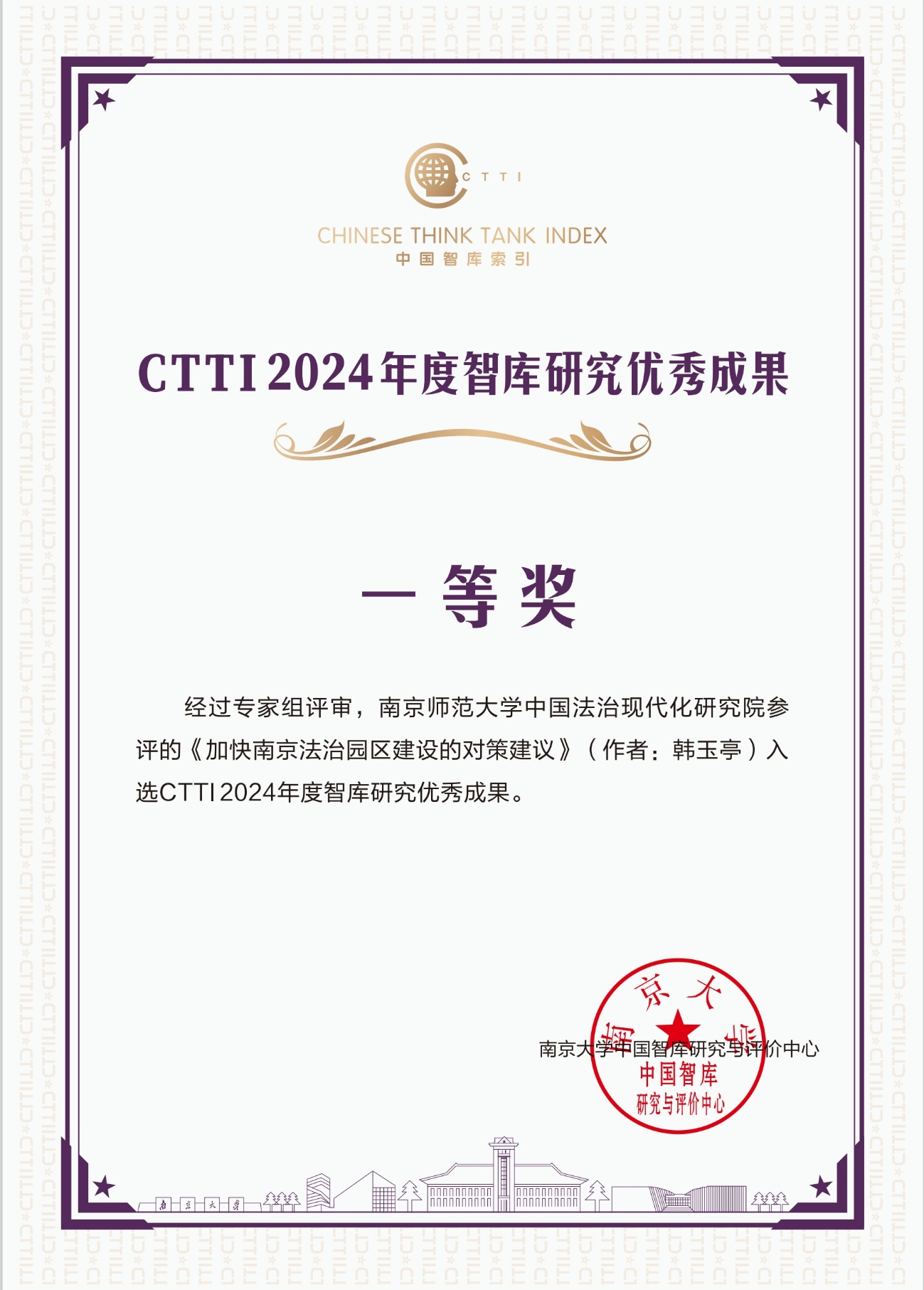 2024年12月7日,南京大學(xué)中國智庫研究與評價中心公布,南京師范大學(xué)中國法治現(xiàn)代化研究院的《加快南京法治園區(qū)建設(shè)的對策建議》入選CTTI2024年度智庫研究優(yōu)秀成果一等獎。
