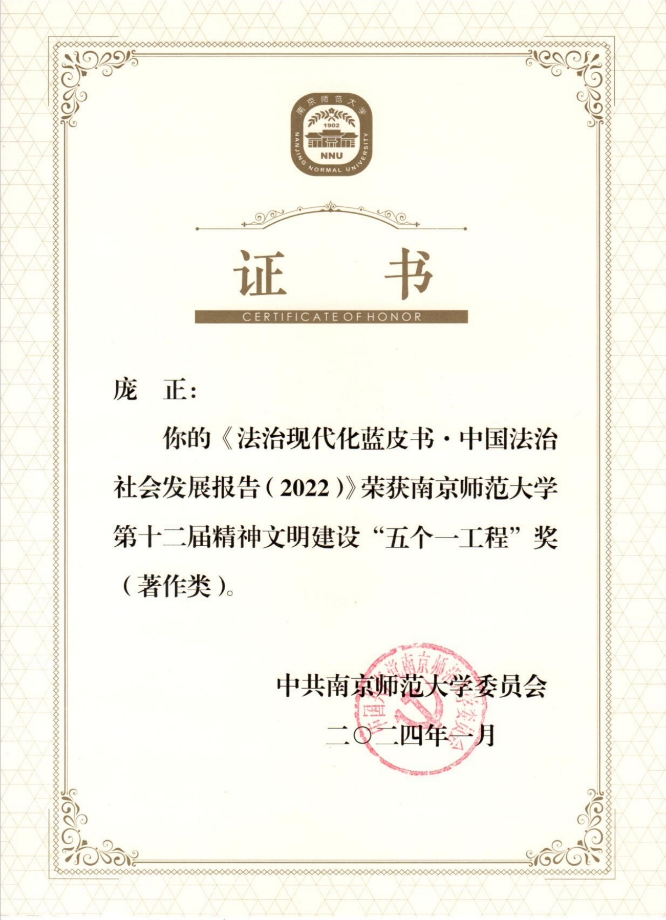 2024年1月,南京師范大學(xué)中國(guó)法治現(xiàn)代化研究院龐正研究員主持的《法治現(xiàn)代化藍(lán)皮書(shū)·中國(guó)法治社會(huì)發(fā)展報(bào)告2022》榮獲南京師范大學(xué)第十二屆精神文明建設(shè)“五個(gè)一工程”獎(jiǎng)。