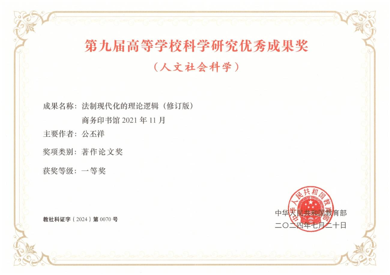 2024年7月,南京師范大學(xué)中國法治現(xiàn)代化研究院院長公丕祥的著作《法制現(xiàn)代化的理論邏輯(修訂版)》榮獲第九屆高等學(xué)??茖W(xué)研究優(yōu)秀成果獎(人文社會科學(xué))一等獎。