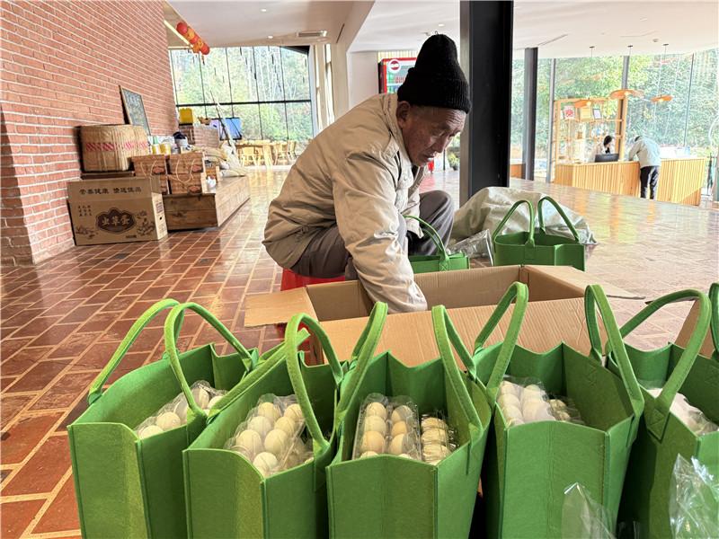 2023年,海洋村嘗試“農業(yè)+民宿”,將村里的養(yǎng)殖的土豬、土雞制作成半成品,包裝成禮盒售賣,“去年剛開始只銷售了二十多萬元。今年的銷售情況很好,從2024年底到現(xiàn)在,已經售賣了六十多萬元?!?馮源淵笑容滿滿,“進入臘月后,已經宰殺了二十多頭黑豬,還有致電想要預定的都沒有了。”