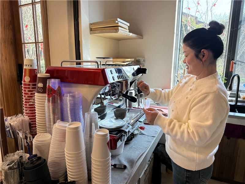 吳巧云正在咖啡屋給游客制作咖啡。人民網記者 張雋攝