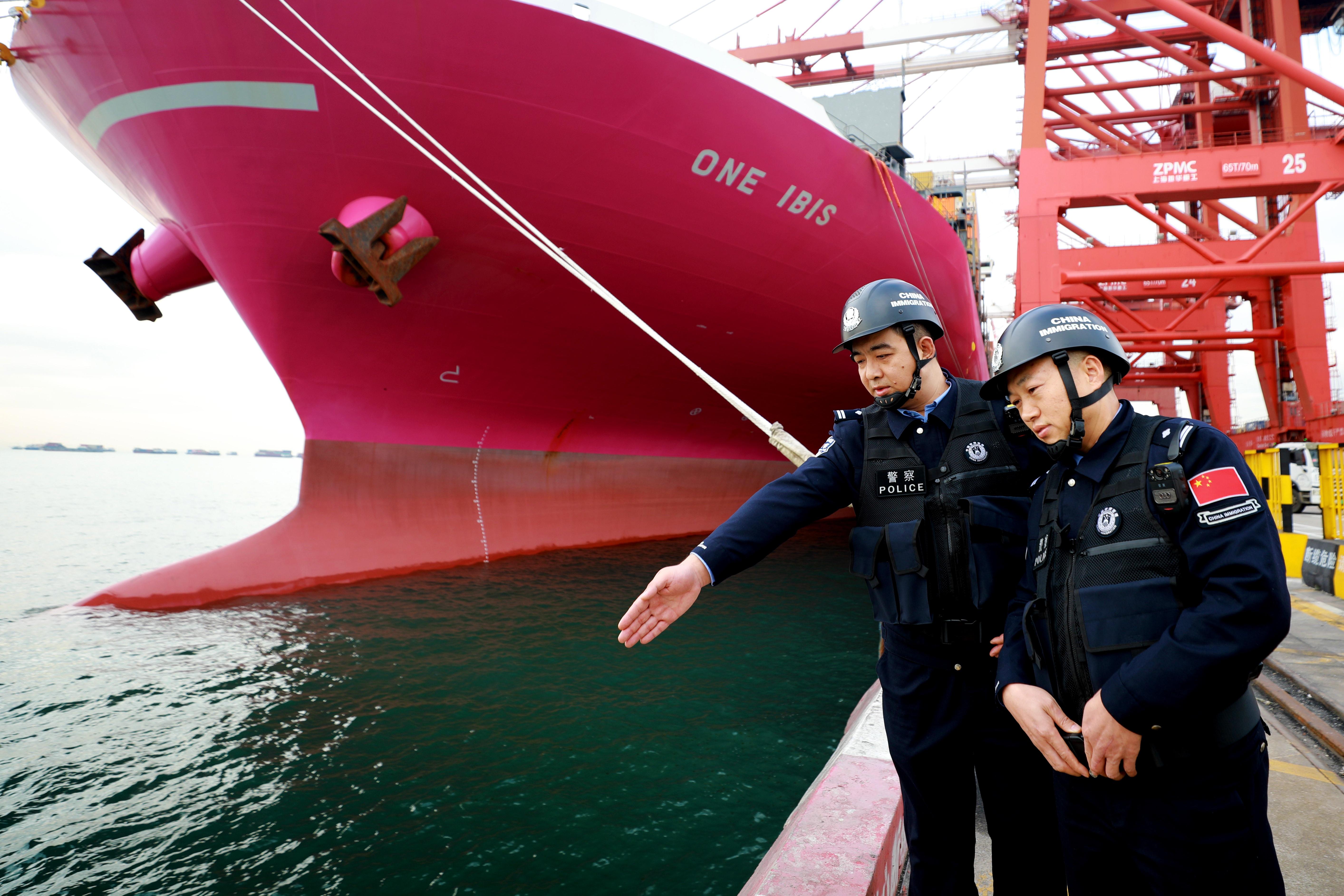 幾十米高的舷梯倚著船體,身著救生衣的劉洪洲雙手緊握欄桿,小心翼翼地一步步登上舷梯,到達(dá)船艙。今天是一名中國籍船東要下船,人證對照無誤后,劉洪洲仔細(xì)檢查行李箱內(nèi)物品,全部核查沒有問題后,登記放行。