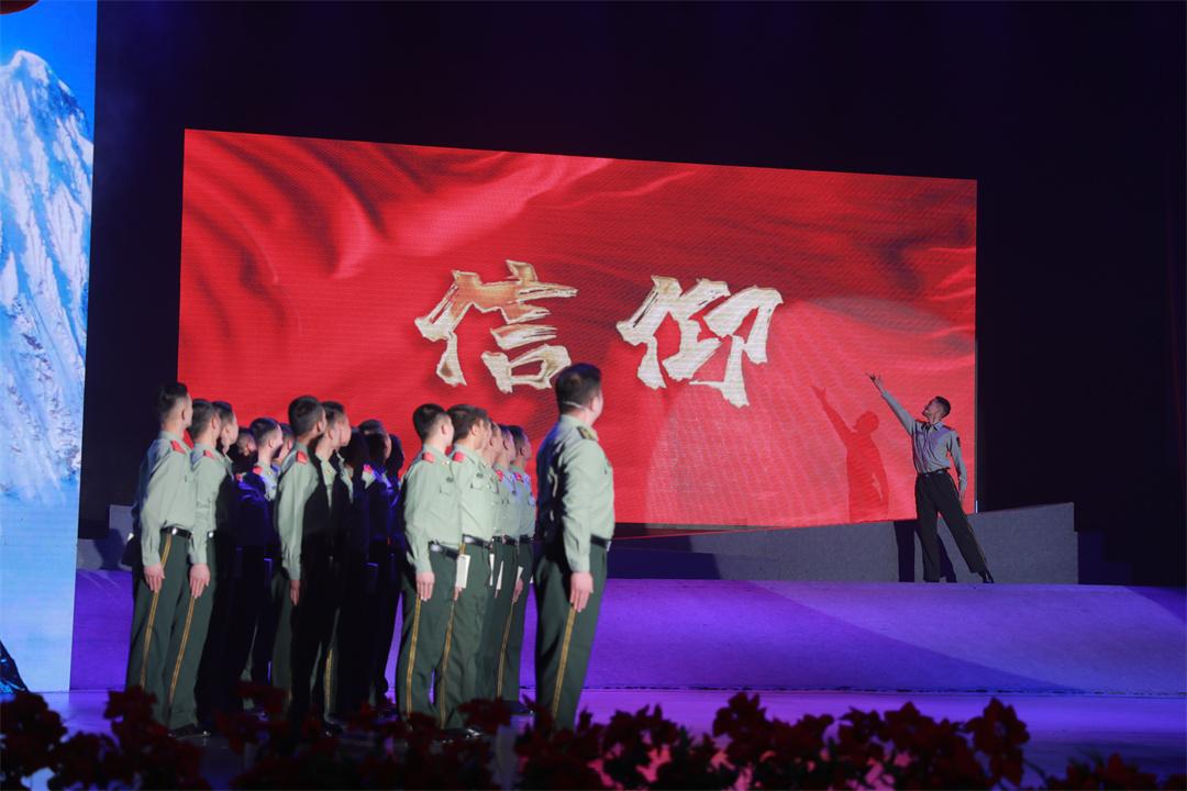 情景表演唱《軍營里來了個藏族兵》,演繹了一名剛?cè)胛椴刈迨勘鎸δ吧h(huán)境毫不畏懼,堅定意志、頑強拼搏,扎根火熱軍營、走好強軍路的故事。