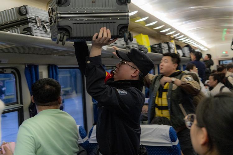 為了滿足大量旅客的出行需求,K27次列車特別增設(shè)至16節(jié)車廂,全車載有超過1000名旅客。沃荻從協(xié)助旅客托運行李,到確保行李擺放整齊、安全;從白天維持車廂內(nèi)秩序,到夜間巡查提醒旅客保管好個人財物……旅途中的每一件小事,他都親力親為,從不馬虎。