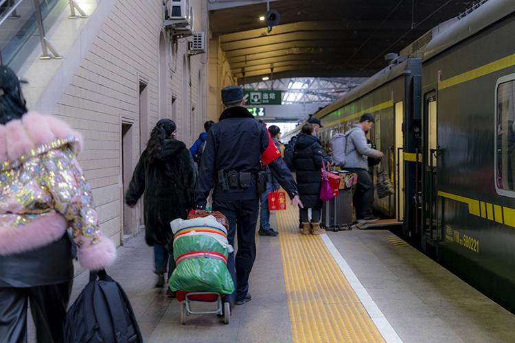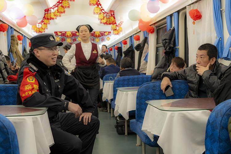 沃荻值乘的K27次列車從北京發(fā)往遼寧丹東,單次往返耗時兩天,他需要連續(xù)值乘兩個來回,共計4天。春運期間,旅客數(shù)量激增,沃荻的工作量也隨之加大?!按哼\期間旅客特別多,比平時要操心許多,我們的職責就是確保每一位旅客安全返鄉(xiāng)”。