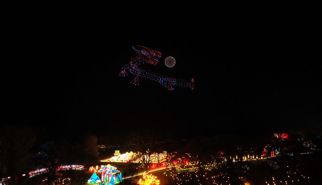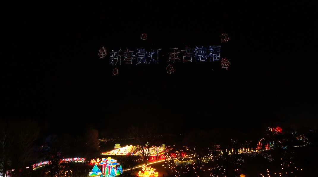 隨著夜色漸深,避暑山莊內(nèi)的氣氛也達(dá)到了高潮。1000架無人機(jī)緩緩升空,它們在天空中排列成各種圖案,從象征吉祥如意的傳統(tǒng)圖案到展現(xiàn)承德自然風(fēng)光的標(biāo)志性建筑,無不令人贊嘆。觀眾紛紛舉起手機(jī),記錄下這一震撼人心的瞬間。其中,“新春賞燈,承吉德?!钡淖謽佑绕湟俗⒛?,它不僅是對新年的美好祝愿,更是對中國傳統(tǒng)文化的生動(dòng)體現(xiàn)。