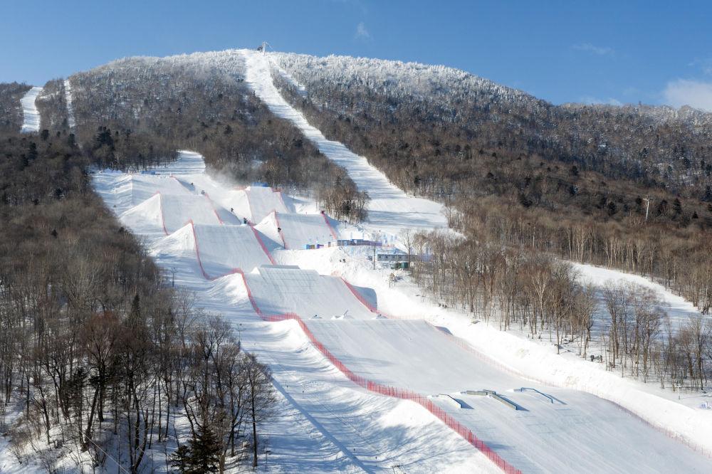 這是1月16日拍攝的位于亞布力滑雪場內(nèi)的第九屆亞冬會坡面障礙技巧場地和大跳臺場地(無人機照片)。新華社記者 謝劍飛 攝