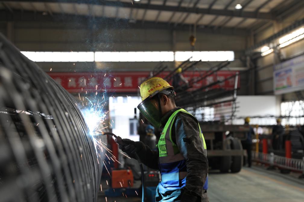 圖為通蘇嘉甬高鐵項目施工人員進(jìn)行鋼筋籠焊接。(中鐵十六局供圖)