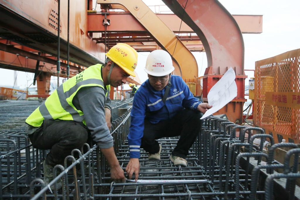 圖為吳基堅(右)核對鋼筋綁扎參數(shù)。(中鐵二十五局供圖)