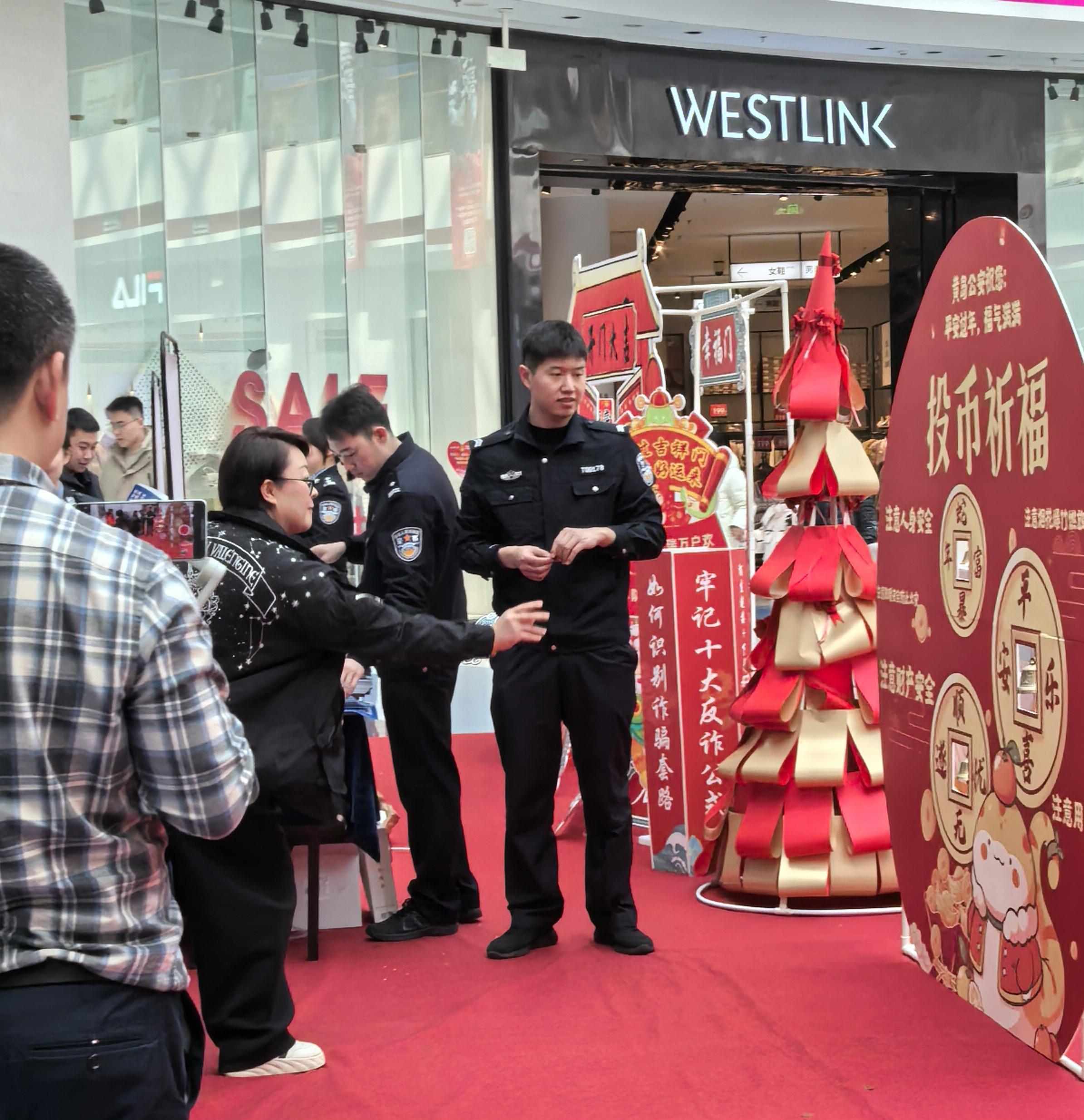 除了“投幣祈?!蓖猓F(xiàn)場(chǎng)還設(shè)有“開(kāi)門(mén)大吉”“跨年迎新”等多個(gè)主題活動(dòng)?!鞍踩庾R(shí)不可忘,攜手相入‘幸福門(mén)’”“反詐防騙伴平安,共同踏進(jìn)‘招財(cái)門(mén)’”……法治元素處處可見(jiàn),參與者絡(luò)繹不絕。
