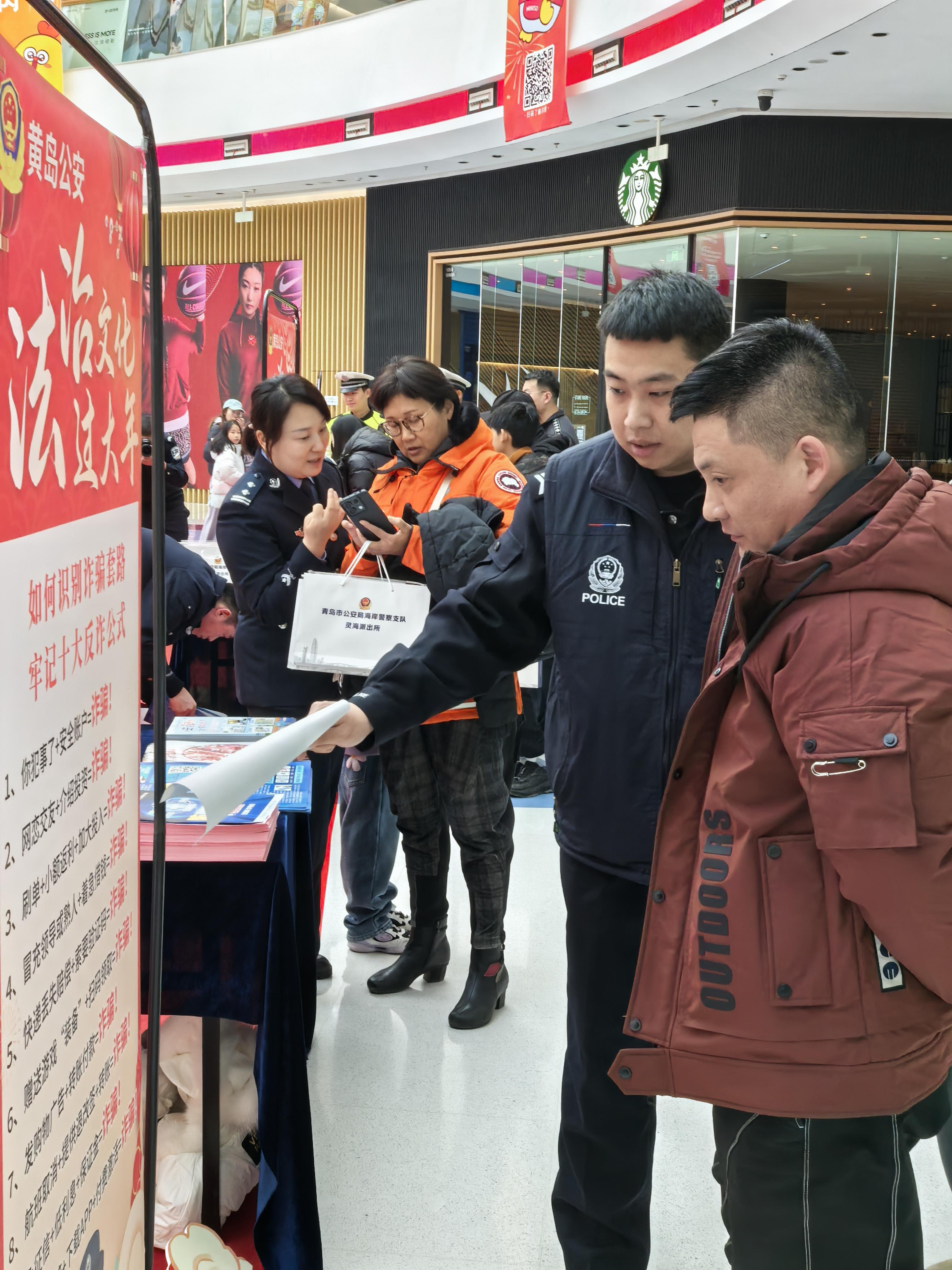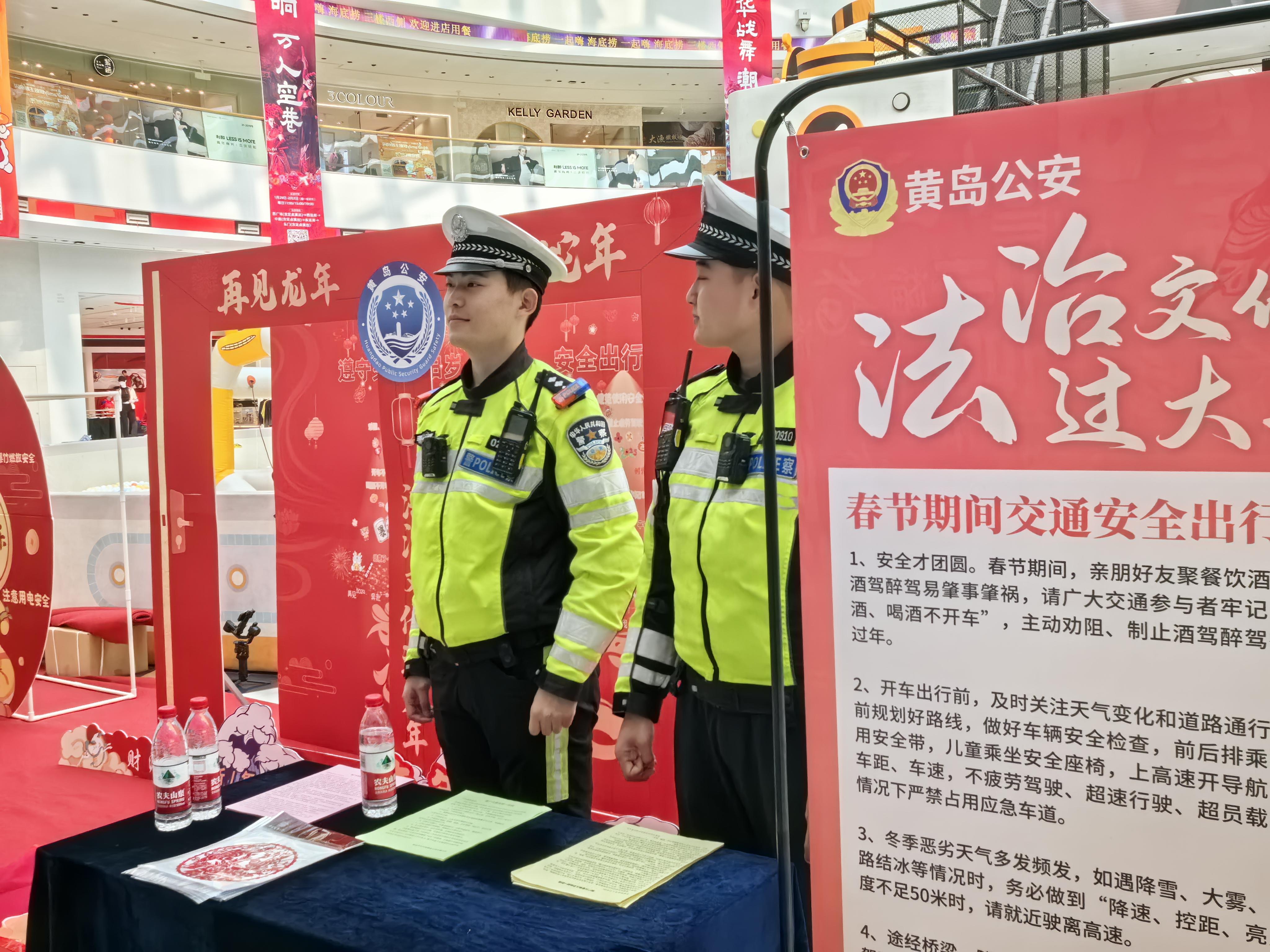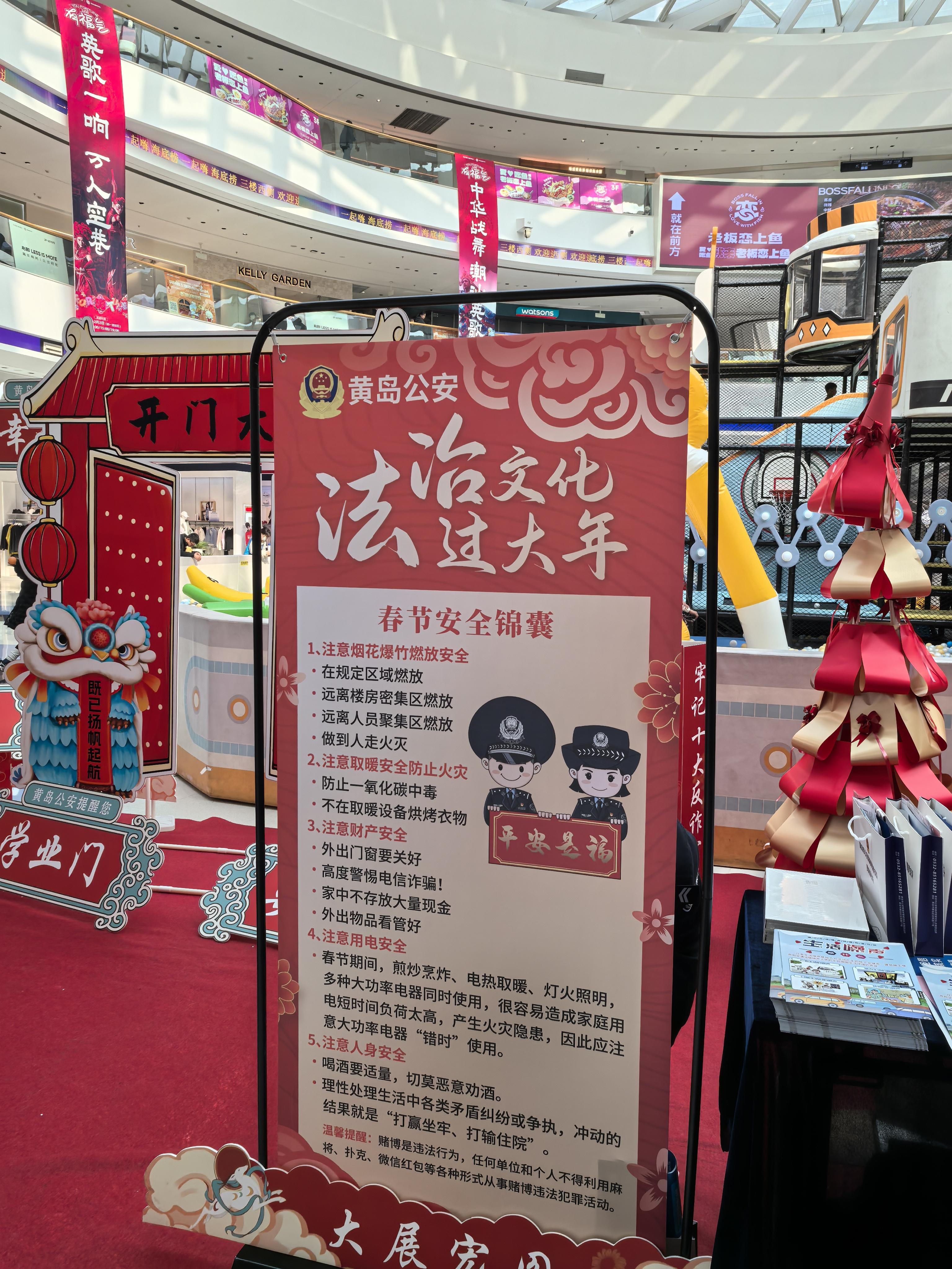 新春佳節(jié),山東省青島市黃島區(qū)某大型商場(chǎng)內(nèi)張燈結(jié)彩,人頭攢動(dòng),洋溢著濃濃的節(jié)日氛圍。在商場(chǎng)中央展廳,黃島公安組織的“法治文化過(guò)大年”宣傳活動(dòng)正如火如荼地進(jìn)行。