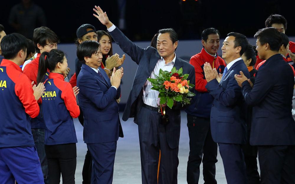資料圖:中國(guó)花樣滑冰隊(duì)總教練姚濱(中)在頒獎(jiǎng)儀式上向觀(guān)眾揮手致意。當(dāng)日,2015奧迪中國(guó)杯花滑大獎(jiǎng)賽在北京首都體育館落幕。在比賽后,姚濱獲頒終身成就獎(jiǎng)。新華社記者 曹燦 攝